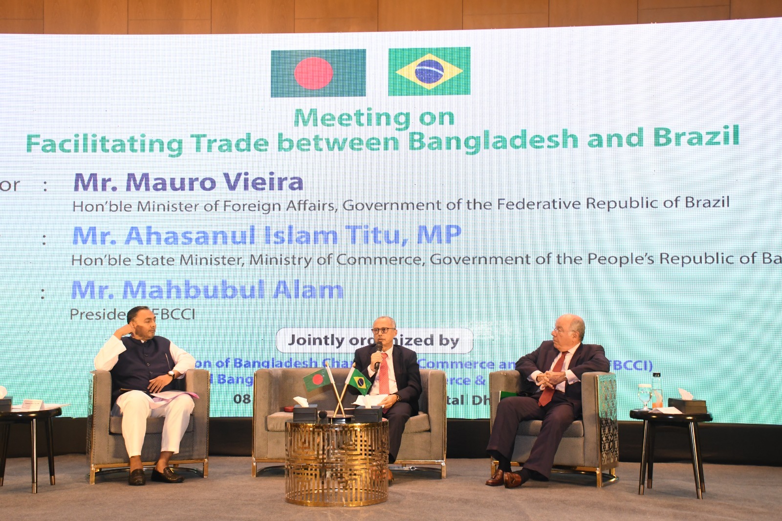 অনুষ্ঠানে সম্মানিত অতিথির বক্তব্যে ব্রাজিলের পররাষ্ট্রমন্ত্রী মাউরো ভিয়েরা বলেন,বিগত দশকে বাংলাদেশে লজিস্টিকস,পরিবহন ও যোগাযোগ এবং অবকাঠামো খাতে ব্যাপক উন্নয়ন হয়েছে। যা ব্যবসা, বাণিজ্য ও শিল্প সম্প্রসারণের সুযোগকে উন্মোচিত করেছে। ব্রাজিল ও বাংলাদেশের পরস্পরের মধ্যে বাণিজ্য সম্প্রসারণের অপার সম্ভাবনা রয়েছে। আমরা বাংলাদেশের সাথে বাণিজ্য সম্পর্ক আরও শক্তিশালী করতে চাই। এ সময় বাংলাদেশে মাংস,গমসহ কৃষিপণ্য রপ্তানির আগ্রহ প্রকাশ করেন তিনি।
