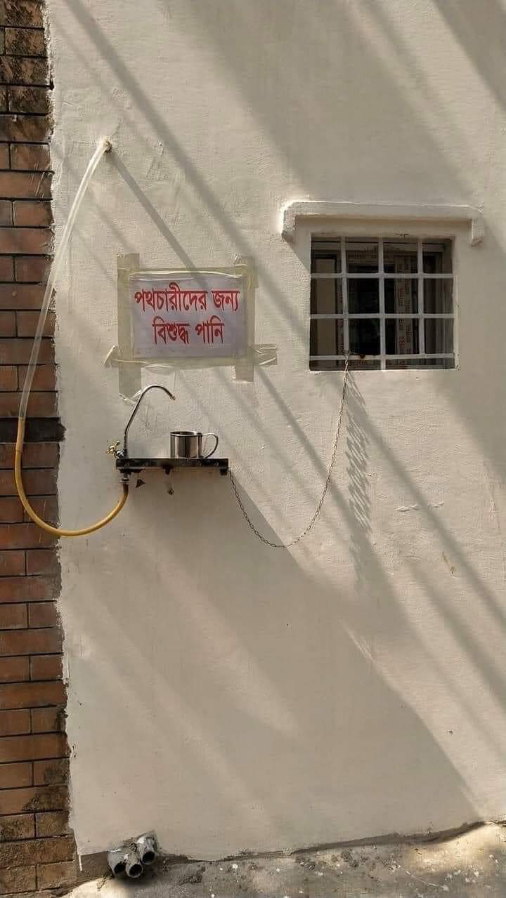 *এ এক চমৎকার দৃষ্টান্ত। এক অভিনব পদ্ধতি। পথে বোতল কিংবা পুলিশ, আনসার, ফায়ার সার্ভিস অথবা কোন কোম্পানির পানির বিতরণ দেখা যায়। কিন্তু বাড়ির দেয়ালে পথচারীদের জন্য বিশুদ্ধ ফ্রী পানি পরিবেশনের ব্যবস্থা সত্যিই এক অভিনব। এমনটি দেখা গেছে রাজধানীর গুলশানে এবং বনানীতে।