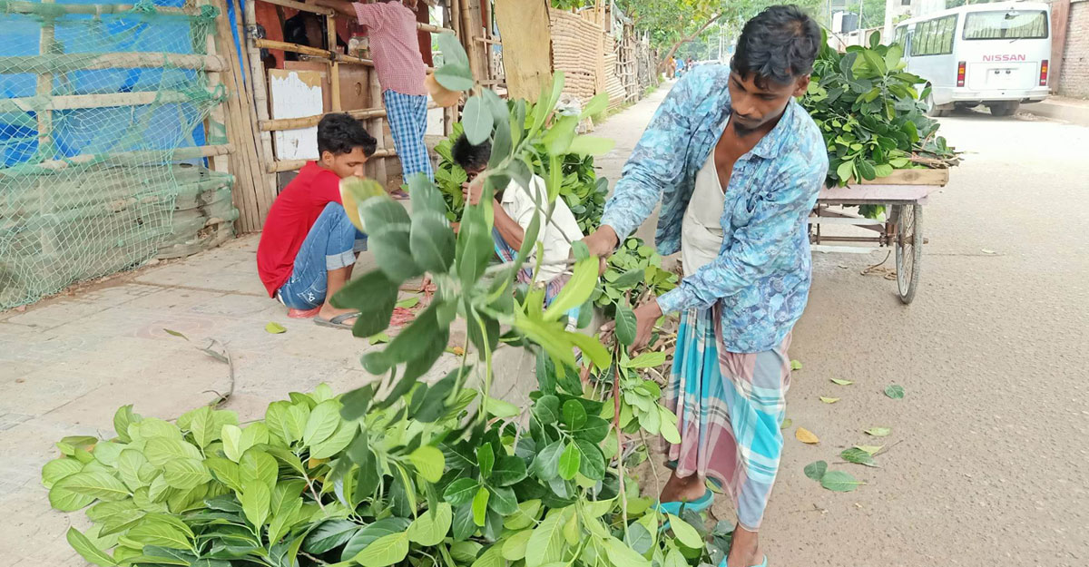 রাজধানীর হাজারীবাগের শেরে বাংলা রোডের তিন মাজার এলাকায় কাঁঠালের পাতা বিক্রি করতে দেখা যায়। বিক্রেতা মাহমুদ হোসেন বলেন, আমাদের নিজস্ব গাছ আছে। সেখান থেকেই এসব কাঁঠাল পাতা সংগ্রহ করা হয়েছে। প্রতি আঁটি ৫০ টাকা বিক্রি হচ্ছে। যারা ছাগল ভেড়া কিনে বাড়ি নিয়ে যাচ্ছেন তারা এই পাতা কিনছেন। ঢাকায় সবাই কাঁঠাল পাতা পাবে না। সেজন্য আমরা গাছ কেটে নিয়ে এসেছি। ভালো বিক্রি হচ্ছে।