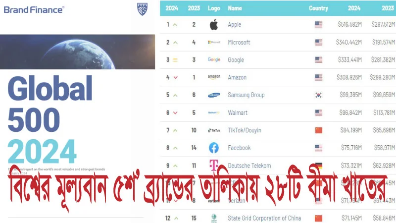 বিশ্বের মূল্যবান ৫শ’ ব্র্যান্ডের তালিকায় ২৮টি বীমা খাতের