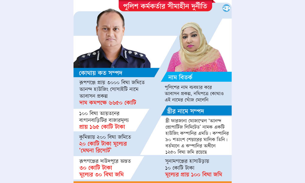 স্ত্রীর নামে আবাসন কোম্পানি্র; আবাসন প্রকল্পের জমি কেনাবেচায় সবখানে প্রকাশ্যে পর্দার সামনে থাকেন অতিরিক্ত ডিআইজি মোজাম্মেল হক। প্রকল্পের পরিচালক হিসেবে নথিপত্রে সইও করেন তিনি। এমনকি প্রকল্পের কর্মকর্তারাও নির্দ্বিধায় স্বীকার করেছেন, এই প্রকল্পের মালিক মোজাম্মেল। কিন্তু আইনের মারপ্যাঁচ এড়াতে কৌশলে স্ত্রীর নামে খুলে দিয়েছেন একটি কোম্পানি। আর স্থানীয়ভাবে ছড়িয়ে দিয়েছেন আবাসন প্রকল্পের জমিগুলোর মালিক তাঁর স্ত্রীর মালিকানাধীন কোম্পানি ‘আনন্দ প্রপার্টিজ লিমিটেড’। ঘটনা বিশ্বাসযোগ্য করে তুলতে প্রকল্পের কিছু জমির মালিকানাও দেখানো হয়েছে এই কোম্পানির নামে।