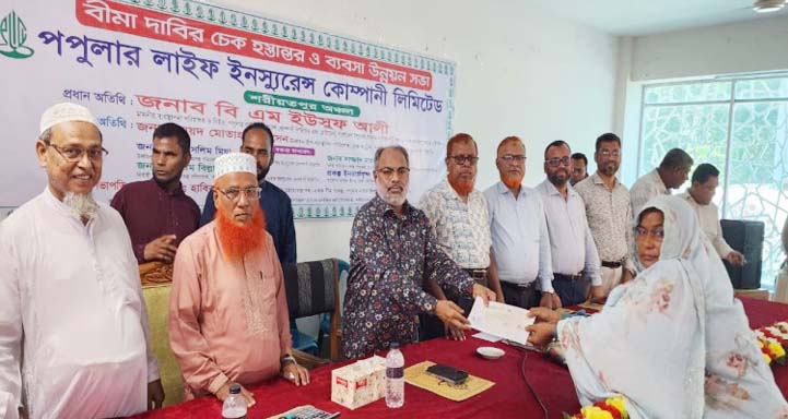 ব্যবসা উন্নয়ন সভা শেষে মেয়াদ উত্তীর্ণ বীমা গ্রাহকের হাতে বীমাদাবীর ২ কোটি ৬৭ লক্ষ টাকার চেক গ্রাহকদের হাতে হস্তান্তর করেন অনুষ্ঠানের প্রধান অতিথি পপুলার লাইফ ইনস্যুরেন্স কোম্পানী লিমিটেডের ব্যবস্থাপনা পরিচালক ও সিইও, বাংলাদেশ ইনস্যুরেন্স ফোরামের প্রেসিডেন্ট ও বাংলাদেশ ইনস্যুরেন্স অ্যাসোসিয়েশনের কার্য নির্বাহী সদস্য বি এম ইউসুফ আলী।